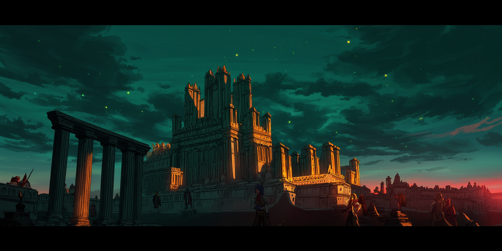 Trojan Legion fortress with emerald and crimson sky
